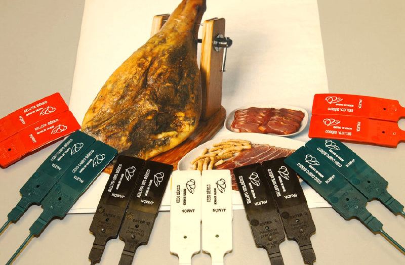 每条Jamón Ibérico根据封签鉴定品质,而Jamón Ibérico的封签一共有四种颜色,并写明了改火腿的食物源和血统纯度: